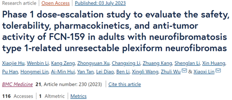 2.?Hu X, et al. Phase 1 dose-escalation study to evaluate the safety, tolerability, pharmacokinetics, and anti-tumor activity of?FCN-159?in adults with neurofibromatosis type 1-related unresectable plexiform neurofibromas. BMC Med. 2023 Jul 3;21(1):230. doi: 10.1186/s12916-023-02927-2.