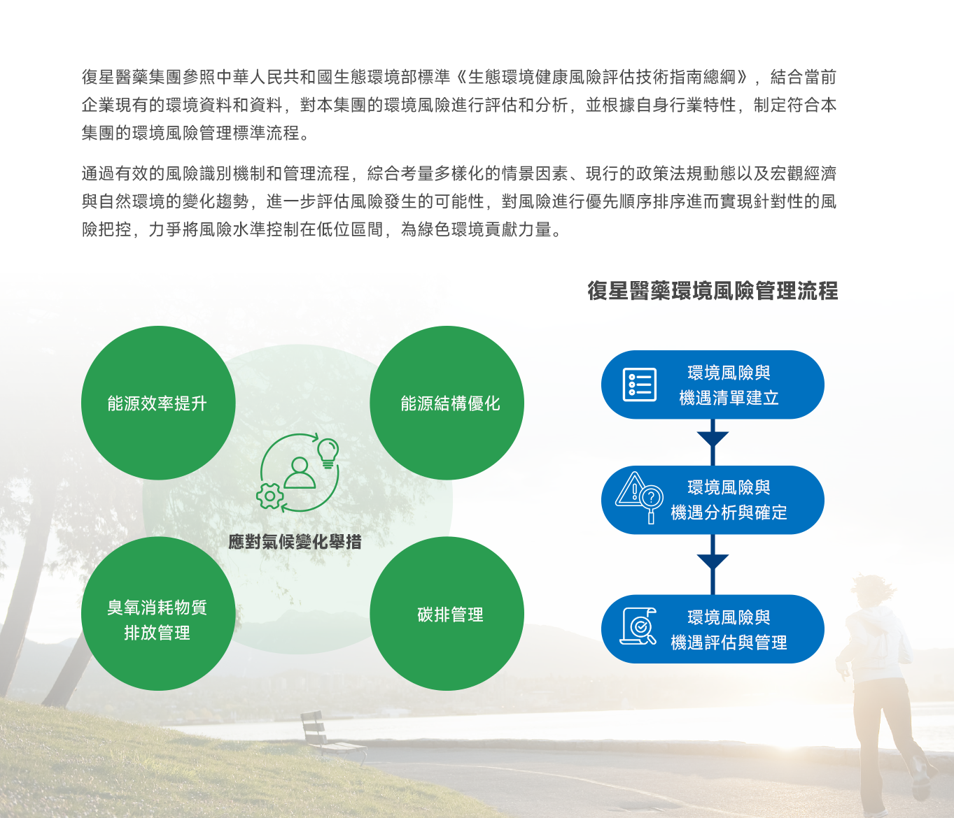 復星醫藥董事會為“應對氣候變化”和“環境治理”議題的最高責任機構,,,,,,,由ESG治理體系周全負責議題的監督、決策、治理和執行。。。。。。。。同時,,,,,,,本集團已將“應對氣候變化”和“環境治理”相關目標與指標納入高級治理層績效审核書中。。。。。。。。
